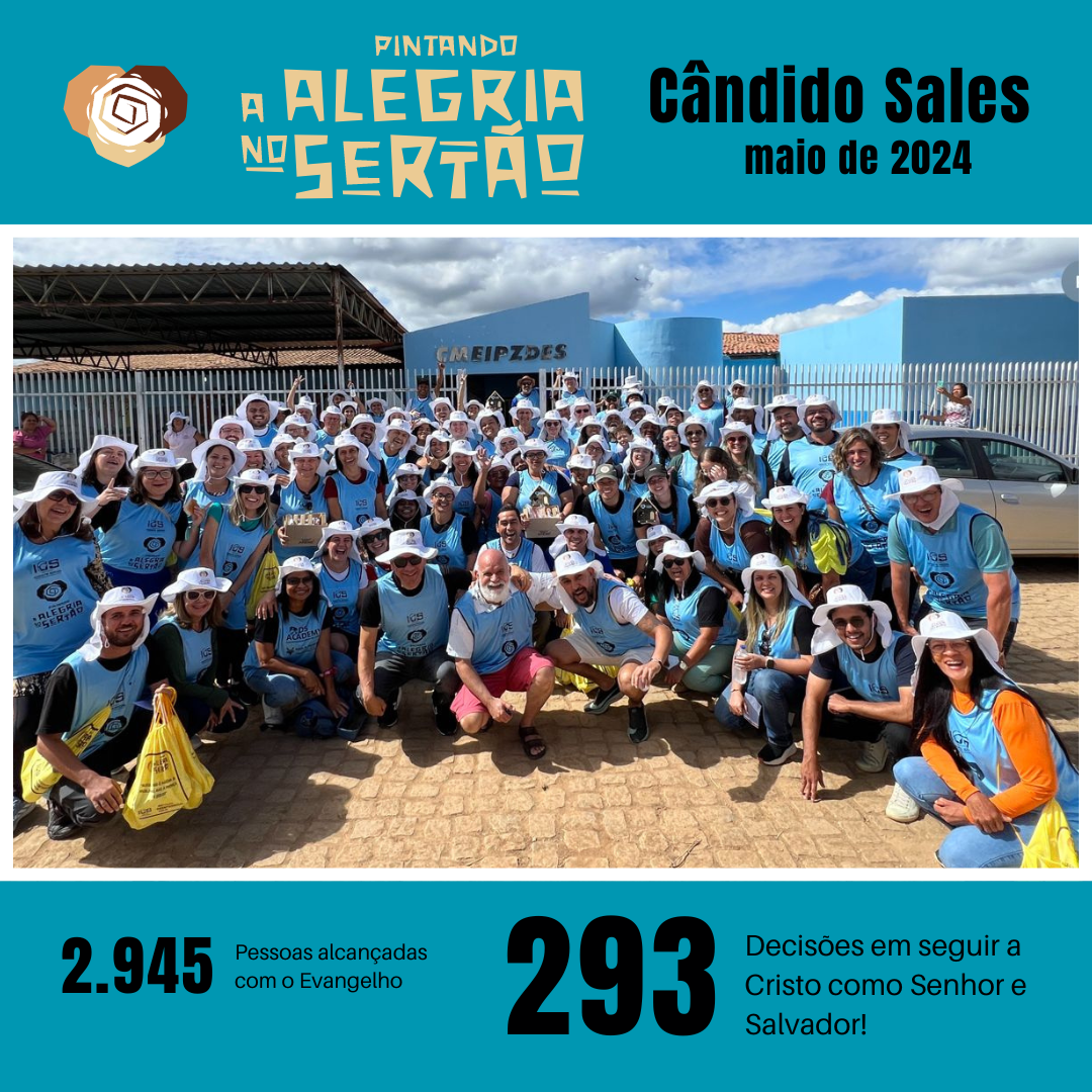 O projeto “Pintando a Alegria no Sertão” foi realizado na cidade de Cândido Sales, BA, durante o mês de maio de 2024. A cidade, localizada a 94 km de Vitória da Conquista, vivenciou um período de muitas atividades estratégicas. Para a segunda edição do projeto, a diretoria do IOS – Instituto Oxente Social realizou várias visitas técnicas à cidade, com o intuito de identificar o bairro mais carente e estabelecer parcerias com o Conselho de Pastores de Cândido Sales. O lema do projeto é “Transformar um bairro e impactar a cidade”, e o slogan para os moradores é “Alegria não é ausência de problemas, mas a presença de Jesus!”.